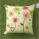 Brightly coloured, whimsical flowers on a pale yellow background would make a lovely pillow for your home.