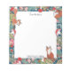 Perfect for anyone who loves foxes and whimsy, this notepad can be personalized with a name for a custom look! Red - orange woodland foxes are scurrying among leaves, ferns and flowers on a dark teal background. There are also berries and mushrooms for each fox to enjoy! Greens, pinks and teal set off the rust animals. Reads, "From the desk of" at the top of the white note area. Original artwork by Tuzi Williams.