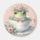 A charming green frog peeks out of a delicate porcelain teacup adorned with soft pink blossoms and gold trim, crowned with a wreath of pastel florals and a tiny royal crown. This endearing scene blends fairytale whimsy with cottagecore elegance, evoking gentle nostalgia and playful storybook vibes. Rendered in a dreamy watercolor style, this sweet composition captures the magic of tea parties and nature’s smallest royalty. Ideal for lovers of frogs, florals, and vintage flair. AI generated artwork.