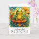 A charming green frog perches on a red mushroom surrounded by bright wildflowers in this whimsical watercolor design. Full of color and character, it's perfect for sending cheerful greetings to nature and animal lovers alike.