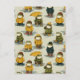 This charming seamless pattern features an array of adorable cartoon frogs, each dressed in vibrant yellow raincoats, cozy hats, and boots, navigating a puddle-filled landscape. With one frog even holding a tiny umbrella, this playful illustration captures the cheerful spirit of a rainy day.