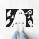 This fun door mat features a large whimsical ghost with your custom name on the lower part of the ghost. The ghost is surrounded by several smaller ghosts, and the word "Boo" in a speech bubble. Click "Personalize this Template" to easily change or remove the featured sample name.