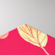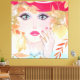 A colourful hand drawn painting of a whimsical girl’s face with large wide open eyes and hand touching her face with golden hair, a pink hat and leaves.