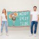 Whimsical ginger haired girl decked out in cute colourful winter outfit with white stacked "Merry Everything" text on aqua background.