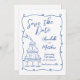 European Inspired Blue and White Fun Swirling Frame Save the Date Card. This whimsical and creative save the date card, inspired by Italian, French, and European elegance, is perfect for couples who want to set a playful yet refined tone for their upcoming wedding. Designed in a classic blue and white palette, the card features a swirling frame with heart details that encircle your wedding information, presented in a charming mix of script and handwritten-style fonts for a casual yet sophisticated feel.