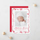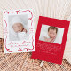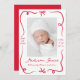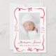 Announce your baby’s arrival with this sweet and festive birth announcement. A hand-drawn red ribbon and bow frame your baby’s vertical photo on the front, with their name and birth details displayed in a beautiful handwritten script. The back includes a horizontal photo with space beneath for your personal message. This bold red design is ideal for Christmas or Valentine’s Day birth announcements, yet timeless enough to celebrate your baby any time of year.