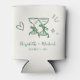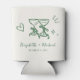 Romantic light cream wedding can cooler featuring whimsical hand-drawn green illustrations of a heart, stars and toasting wine glasses and the names of the bride and groom in a fun and playful green script.