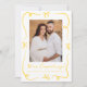 Share your joyful news with this cheerful pregnancy announcement featuring your vertical photo on the front, framed by hand-drawn yellow ribbons and bows on a white background. A handwritten yellow “We’re Expecting!” script pairs with your baby’s due date and names underneath. The back includes space for a horizontal photo and custom message, making it a bright, gender-neutral way to announce your pregnancy.