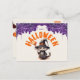 This adorable Halloween postcard features a cute kitten dressed as a little witch, complete with a pointy hat and broomstick. Set against a festive backdrop of purple spider webs and bold "Happy Halloween" text, this charming design is perfect for sending cheerful Halloween greetings to friends and family of all ages. The playful and sweet illustration is sure to bring a smile to anyone's face, making it an ideal choice for spreading spooky season joy.