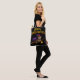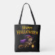 Żużel tabby witch kitten tote bag featuring a cheerful tabby kitten soaring through the night sky in a purple witches hat and cape. This high detailed design is complete with a glowing lantern and a bold happy Halloween greeting set against a sleek black background. This durable and spacious bag is perfect for grocery runs but because or as a fun trick or treat bag, it's a must have accessory for a cat lovers and anyone looking to add a touch of whimsical enchantment to their every day October adventure