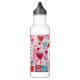 Water bottle with a whimsical pattern. Scrapbook style doodles and scribbles. Red and pink hearts and various letters and envelopes scattered all around.