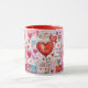 A mug with a whimsical pattern. Scrapbook style doodles and scribbles. Red and pink hearts and various letters and envelopes scattered all around.