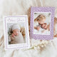 Announce your little one’s arrival with this elegant soft lavender photo birth announcement card. The front features your baby’s photo surrounded by a whimsical hand-drawn heart border, with their name in a playful, charming script. The soft lavender and white colour palette adds a warm, modern touch that’s perfect for celebrating baby girls. The back includes a second photo framed in white, accented by a delicate soft lavender heart pattern. Personalize the text and photos to create a beautiful keepsake for family and friends.