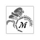 An illustration of a whimsical hooded grasshopper with facial hair. The insect is perched on grass. The grass is curled down in circle shape make a frame around a M. M is short for monogram and can be personalized for your own initial.