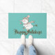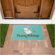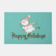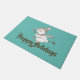 Whimsical holiday doormat features ice skating snowman with brown and pink scarf and beanie on aqua background and customizable text.