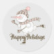 Adorable holiday sticker features hand drawn whimsical ice skating snowman with customizable text on grey background