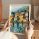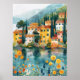 Bring vibrant European charm to your home with this whimsical art print featuring a colourful lakeside village nestled among cypress trees and wildflowers. With warm yellow and terracotta buildings reflected in tranquil blue waters, this scene evokes the romance of the Italian coast or a peaceful Mediterranean getaway. Perfect for travel lovers, cottagecore fans, or anyone craving a cheerful burst of floral colour and scenic serenity on their walls.