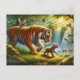 A vibrant and enchanting jungle scene where a mother tiger and her playful cub traverse a lush, sunlit clearing. Colourful birds, including parrots and various songbirds, flutter around, adding splashes of colour against the verdant backdrop. A serene waterfall cascades gently in the background, creating a mist that catches the golden light filtering through the dense canopy above. Nearby, a group of deer stand alert, observing the tigers' journey through the forest. Wildflowers and ferns blanket the ground, and sunlight streams through the trees, illuminating the scene with a warm and magical glow.