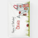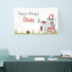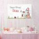 Cute, girly and personalized happy 1st Birthday banner featuring an adorable girl ladybug sitting on swing, which is hanging from an adorable garden watering can house, two additional ladybugs join in this whimsical and magical garden party scene. Personalize this beautiful birthday party banner with girl’s name and customize greeting as needed.