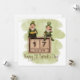 Whimsical design features two leprechauns perched on calendar cube for March 17th, with moss green watercolor wash background and customizable "Happy St. Patrick's Day" text in handwritten style brown font.
