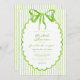 This whimsical bridal shower invitation features a bright lime green watercolor bow and a playful scalloped oval frame against a classic lime green and white striped background. Perfect for a shower with a preppy or coastal aesthetic, this charming design provides a sweet, hand-painted look for your special celebration. Created by Simply Farmhouse Press.