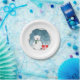 Adorable paper plates with an illustration of a little polar bear sitting on the floor wearing green scarf. He has a bright red present. Great for boy baby shower parties, winter birthdays and Christmas celebrations. The image looks like is in three dimensions but it's just a print. Illustrated and designed by Patricia Alvarez.