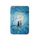 Two cats sitting on a branch watching the full moon with a blue sky filled with stars. The branches of the trees surrounding them with small yellow flowers. Black tuxedo cat and a bi-colour white and grey spotted cat. Original Modern Whimsical Acrylic Painting by Donna Leger. All Rights Reserved. ©irony designs