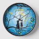 Two cats sitting on a branch watching the full moon with a blue sky filled with stars. The branches of the trees surrounding them with small yellow flowers. Black tuxedo cat and a bi-colour white and grey spotted cat. Original Modern Whimsical Acrylic Painting by Donna Leger. All Rights Reserved. ©irony designs