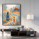 Rendered in a textured, vintage storybook style with calming blue and warm orange tones, the design brings a nostalgic and comforting atmosphere to any space. The flowing paths, stylized plants, and gentle figures create a dreamy narrative scene reminiscent of classic children's book illustrations and traditional folk art.