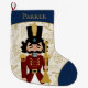 Personalized Nutcracker Christmas Stocking Bring whimsical charm to your holiday decor with this personalized Nutcracker Christmas stocking. Featuring a classic Nutcracker soldier standing tall on a rich beige background adorned with holly leaves and berries, this stocking captures the festive spirit of the season. The rich blue banner at the top adds a perfect spot for personalization, making it a cherished addition to any fireplace mantel. Ideal for adding a traditional yet playful touch to your Christmas celebrations. Perfect for holiday gifting or creating a personalized holiday experience.
