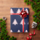 A pattern of pale pink Christmas trees appears on this midnight blue wrapping paper.