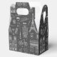 Whimsical favour box / small bakery box pattern features all the best of Paris life, from the Eiffel Tower and Arc de Triomphe to bistro seating and macarons. White doodles on chalkboard grey background.