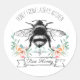 A whimsical elegant personalized product label featuring a hand sketched vintage bee with watercolor floral and banner in the round, and unique hand lettered style typeface.