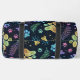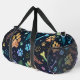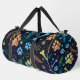 This unique duffle bag features a whimsical colourful pattern on a black background, showcasing various coloured paw prints, bones, and leafy details. It's a practical pet accessory and versatile organizer for travel and everyday use.
