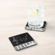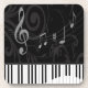 A whimsical musical design with curved piano keyboard keys and musical notes on a subtle flourish pattern in grey on a black background. Ideal for the pianist, piano student or the piano lover.