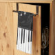 A whimsical musical design with curved piano keyboard keys and musical notes on a subtle flourish pattern in grey on a black background. Ideal for the pianist, piano student or the piano lover.