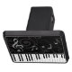 A whimsical musical design with curved piano keyboard keys and musical notes on a subtle flourish pattern in grey on a black background. Ideal for the pianist, piano student or the piano lover.