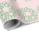 A pattern of green Christmas wreaths appears on this pale pink wrapping paper.