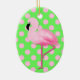 Colourful Christmas tree / decorator ceramic ornament, with graphics of a a fluffy looking pink flamingo, against a whimsical bright green with pink polka dot background. Add any text you want by customizing this ornament. Fun gift idea for any flamingo lover.