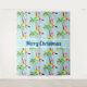 with the text: Merry Christmas. A whimsical drawing of a pink flamingo wearing a red santa hat. Standing on a mound of yellow beach sand with a green and brown coconut palm tree in the back. Light blue background. Cute and fun festive tropical design.