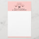 Stationery paper with a drawing of a cute pink pig's face. Wearing a black bow tie. Lifted up by his black cloven hooves and peering over a table. Cute and whimsical drawing. Set on a pink background with some faded hearts here and there.