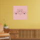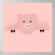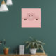 Poster with a drawing of a cute pink pig's face. Lifted up by his black cloven hooves and peering over a table. Cute and whimsical drawing. Set on a pink background with faded hearts. Adorable nursery art.