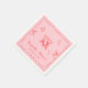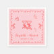Trendy retro-inspired pink wedding napkins for your engagement party, rehearsal dinner, reception, etc., featuring a red wavy frame adorned with coquette bows, whimsical hand drawn illustrations of a heart, stars and wine glasses, and the names of the bride and groom in a playful red script.