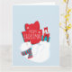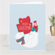 Whimsical Holiday card features a scarf wearing polar bear juggling presents on his hind feet. Teal, red and white graphic on light blue background gives it a retro holiday feel.
