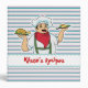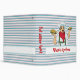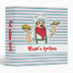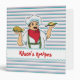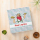 Whimsical retro chef striped recipe binder, featuring a retro, cute chef in whimsical style wearing his cooking uniform whites and hat –toque- and a red scarf and holding two dishes one with a chicken and one with fruit, a striped pattern in lavender purple, blue, white, light pink and a scalloped band with text. This fun design is fully customizable and can be personalized.