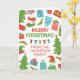 Whimsical folded Christmas greeting card personalized with your name on the cover and a family photo inside. This folded Christmas card features a fun retro design full of Christmas trees, wrapped Christmas gifts, holly, elf hats, elf shoes and colourful Christmas lights in a quirky illustration style in red, blue, and green for a 50s inspired retro look.
