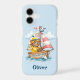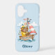 This charming personalized sailor bear phone case features an adorable brown bear wearing a classic yellow rain slicker and hat, happily steering his wooden boat.
