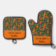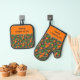 The Whimsical Scattered Autumn Leaves Acorns Oven Mitt & Pot Holder Set has bright green and orange leaves with brown acorns dance across a dark brown background, creating a playful autumn vibe. The saying “Leaf the Cookin to (Name)” adds a funny twist, making this personalized autumn leaf oven mitt a whimsical fall baking gift.