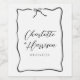 A simple handwritten script modern minimalist black and white typography wedding wine labels, framed with a wavy ribbon frame with bow in a hand drawn style. Informal whimsical coquette style.