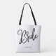 This stylish tote bag features modern black handwritten script and says "bride", with a spot to add your name.